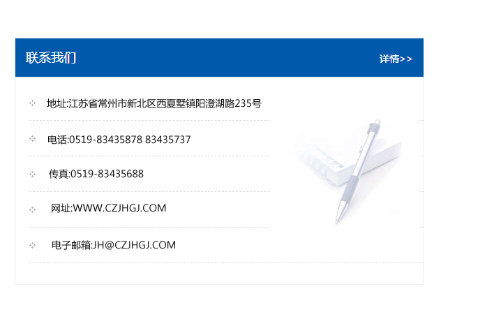 地址:常州市新北區友邦商務大廈1幢16、17層  電話:0519-85101652  傳真:0519-85112595  郵編:213022  網址:www_cz-jiayue_cn.longtuzs.com  郵箱:xiajifengaa@163.com
